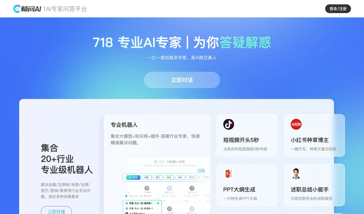 畅问AI是国内领先的AI专家顾问助手平台,官方精选复刻10000+各行各业专家,整理了他们的知识/专业技能/疑难杂症问题,实现AI在线精准咨询。同时支持文心一言、通义千问、月之暗面Kimi、讯飞星火等数十家AI大模型。助力您职场办公与学习效率提升,解决生活、情感、娱乐等多领域不同场景需求。