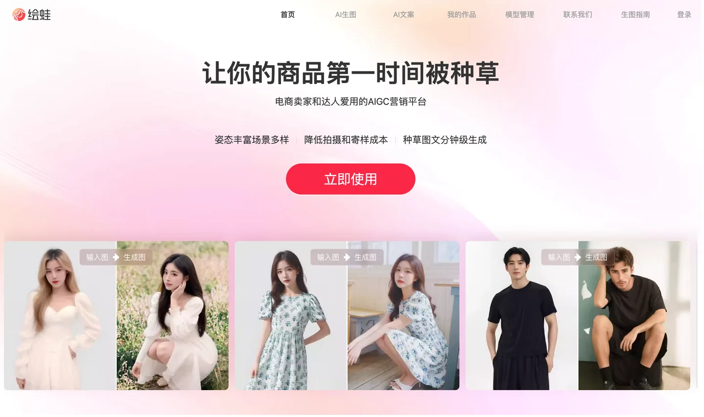 绘蛙是面向电商卖家和达人的AI创作平台,可以低成本创作丰富的商拍图 & 种草文案 我们能为商家提供三大助力 : ” 多:用AI创作丰富的图片,满足下游进货商/用户对图片的差异化诉求,提升店铺竞争力 快:无需协调模特档期,无需高薪聘请商拍和写手团队,使用绘蛙AI一键生成商品图和文案,让商品第一时间被消费者种草 省:减少请模特、外拍、寄样的成本 绘蛙特色功能如下: AI生图 a. 固定姿势:一键换模特换场景 低成本生成有氛围感的商品上身图,便于卖家快速上货、复刻爆款商品 b. 自由姿势:生成姿势可控的商品图 通过参考图控制生图姿势、场景、构图、身材,轻松复刻爆款图 c. 海量商用模特库,持续更新 平台提供50+已经训练好的海内外模特,无版权风险,可直接用于商拍场景 不同肤色、风格模特,可低成本创作跨境商拍图,适配不同品类的服饰 d. 支持训练自有模特 支持商家训练自有模特,便于打造统一的店铺人设、图片风格 AI生文 a. 一站式商品种草 输入电商平台链接,可以一键获取电商数据,生成商品卖点,匹配高热笔记话题 b. 结合达人人设,个性化种草 设置人设标签如大码,成熟风,打工人,普通人等 c. 高效复刻爆款内容 爆文改写,轻松复制爆款内容 d. 添加热门搜索词和emoji,获取更多流量 用户可选择将近期热搜词嵌入文章内,提升笔记流量,同时可以让笔记生成更多emoji表情,让内容更加生动