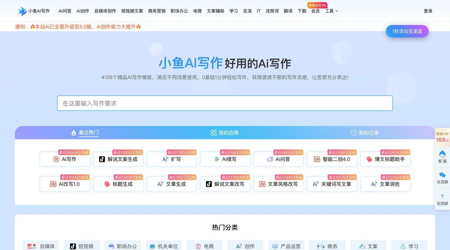 满足自媒体人和办公人写作创作的在线智能AI写作平台,可以用AI自动生成高质量原创内容,内容创作覆盖多种类型,满足不同场景